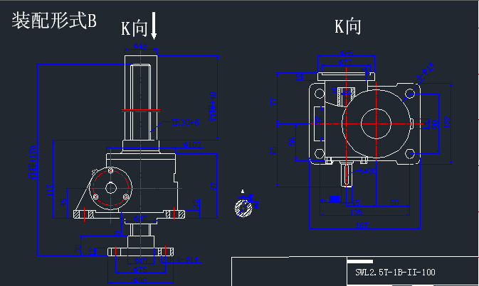 結(jié)構(gòu)型式分為1型:蝸輪與螺桿為螺紋連接,螺桿作軸向運動;2型:蝸輪與螺桿為鍵連接,螺桿上配螺母,螺桿上的螺母作軸向運動。1型結(jié)構(gòu)型式又分為兩種裝配型式即A:螺桿工作端在上;B螺桿工作端在下。2型結(jié)構(gòu)型式也有兩種裝配型式即:A:螺桿工作端在上,螺母上頂或下拉;B螺桿工作端在下,螺母下壓或上拉。