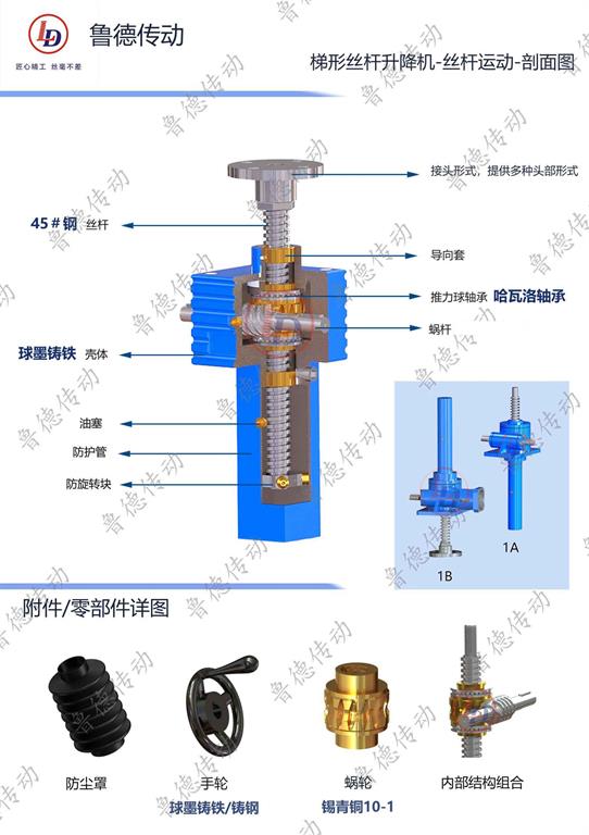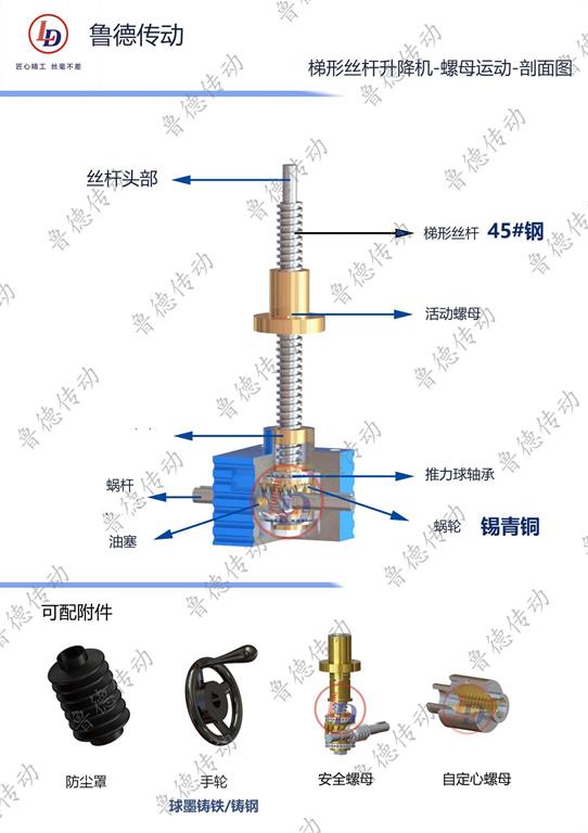 升降機(jī)絲桿和分為梯形絲桿/滾珠絲桿/不銹鋼絲桿,采用臺(tái)灣TBI和上銀的軋制工藝,達(dá)C7標(biāo)準(zhǔn),不銹鋼絲桿采用304或316材質(zhì)加工而成,耐磨耐腐,適用于食品、醫(yī)療等行業(yè)。蝸輪使用錫青銅10-1,銅材質(zhì)采用離心澆鑄工藝,材質(zhì)更耐磨。蝸桿使用45#鋼,阻力小,提高傳動(dòng)效率。 蝸輪使用錫青銅10-1,銅材質(zhì)采用離心澆鑄工藝,材質(zhì)更耐磨。