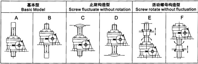 1、基本形式:螺母(蝸輪)轉(zhuǎn)動絲桿上下移動,此為普通型升降機(jī)安裝方式。