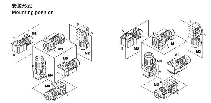 結(jié)構(gòu)形式:K普通軸伸式、KA軸裝式、KF軸伸法蘭式、KAF軸裝法蘭式、KAZ軸裝小法蘭式、KAT軸裝帶防轉(zhuǎn)臂、KAB軸裝底腳式。