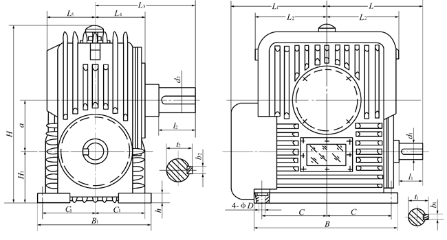 、型平面二次包絡(luò)環(huán)面蝸桿減速器主要尺寸PWU型減速器主要尺寸(整體式) /mm a | H1 | B | B1 | C | C1 | D | H | L | L1 | L2 | L3 | L4 | L5 | d1 | b1 | t1 | l1 | d2 | b2 | t2 | l2 | h | 80 | 100 | 250 | 190 | 112 | 80 | 14 | 315 | 160 | 160 | 125 | 180 | 100 | 90 | 25 | 8 | 28 | 42 | 45 | 14 | 48.5 | 82 | 30 | 100 | 112 | 300 | 236 | 130 | 100 | 16 | 355 | 200 | 200 | 160 | 212 | 125 | 118 | 32 | 10 | 35 | 58 | 55 | 16 | 59 | 82 | 35 | 125 | 125 | 355 | 280 | 160 | 125 | 18 | 450 | 236 | 236 | 190 | 250 | 150 | 140 | 38 | 10 | 41 | 58 | 65 | 18 | 69 | 105 | 38 | 140 | 140 | 400 | 315 | 180 | 140 | 20 | 500 | 265 | 265 | 212 | 280 | 160 | 160 | 42 | 12 | 45 | 82 | 70 | 20 | 74.5 | 105 | 40 | 160 | 160 | 450 | 355 | 200 | 160 | 21 | 560 | 300 | 300 | 236 | 315 | 190 | 180 | 48 | 14 | 51.5 | 82 | 80 | 22 | 85 | 130 | 42 | 180 | 180 | 500 | 400 | 225 | 180 | 22 | 630 | 335 | 335 | 265 | 355 | 212 | 200 | 56 | 16 | 60 | 82 | 90 | 25 | 95 | 130 | 45 | 200 | 200 | 560 | 450 | 250 | 200 | 24 | 710 | 355 | 355 | 300 | 400 | 236 | 224 | 60 | 18 | 64 | 105 | 100 | 28 | 106 | 165 | 50 | 225 | 225 | 630 | 500 | 280 | 225 | 26 | 800 | 400 | 400 | 315 | 450 | 265 | 250 | 65 | 18 | 69 | 105 | 110 | 28 | 116 | 165 | 53 | 250 | 250 | 670 | 530 | 300 | 250 | 28 | 850 | 450 | 450 | 355 | 500 | 280 | 280 | 70 | 20 | 74.5 | 105 | 125 | 32 | 132 | 165 | 56 | 280 | 280 | 800 | 600 | 355 | 280 | 30 | 950 | 475 | 475 | 400 | 560 | 315 | 315 | 85 | 22 | 90 | 130 | 140 | 36 | 148 | 200 | 60 | 315 | 315 | 900 | 670 | 375 | 315 | 32 | 1060 | 560 | 560 | 450 | 630 | 355 | 355 | 90 | 25 | 95 | 130 | 150 | 36 | 158 | 200 | 67 | 355 | 355 | 1000 | 750 | 425 | 355 | 35 | 1250 | 670 | 670 | 500 | 710 | 400 | 400 | 100 | 28 | 106 | 165 | 170 | 40 | 179 | 240 | 75 |