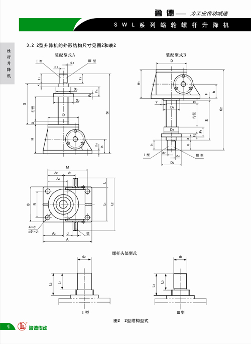 SWL蝸輪螺桿升降機(jī)規(guī)格型號(hào)有2.5T、5T、10T、15T、20T、25T、35T、50T、100、120T十種。結(jié)構(gòu)型式分為:蝸輪與螺桿為螺紋聯(lián)接,螺桿作軸向運(yùn)動(dòng)型;蝸輪與螺桿為鍵聯(lián)接,螺桿上配螺母,螺桿上的螺母作軸向運(yùn)動(dòng)兩種型式。有不同的裝配型式和絲桿頭部形式可選,速比有普通速比和慢速比兩種。