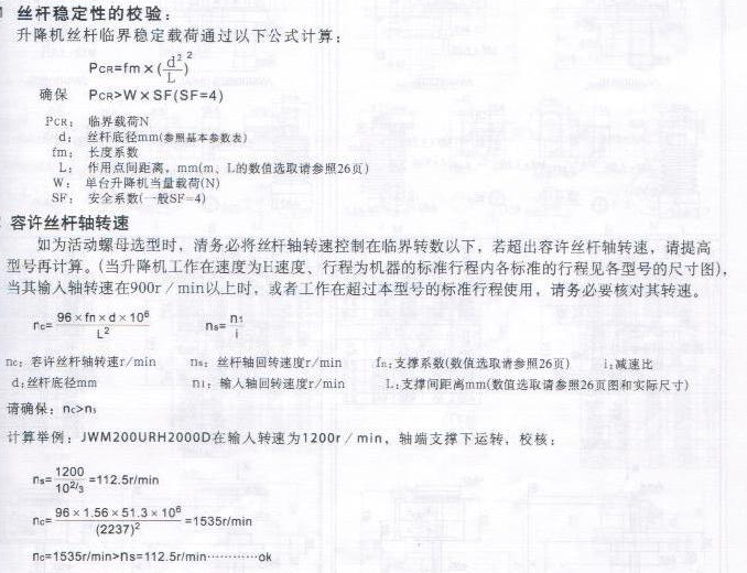 升降機(jī)的容許_載荷、容許外加負(fù)載、容許絲桿軸的旋轉(zhuǎn)速度等項(xiàng)目進(jìn)行效驗(yàn),如_過(guò)產(chǎn)品的數(shù)據(jù)將會(huì)對(duì)整個(gè)升降設(shè)備造成重大損傷。
