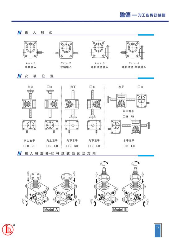 有絲桿運動式和螺母運動式兩種,不同使用場合,選擇不同型式的升降機。絲桿運動式是運用蝸輪旋轉(zhuǎn)驅(qū)動絲桿直線運動,運行中絲桿不旋轉(zhuǎn),絲桿運行上下需有足夠空間。螺母運動式為絲桿與蝸輪固定,驅(qū)動螺母上下運動,運行中絲桿旋轉(zhuǎn)。
