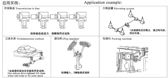 轉(zhuǎn)向器可做并排傳送;立體車庫(一臺(tái)減速機(jī)驅(qū)動(dòng)左右鏈輪同步運(yùn)轉(zhuǎn)),升降平臺(tái),包裝機(jī),游戲機(jī)應(yīng)用等。T型轉(zhuǎn)向箱具有多種安裝形式,選用方便。